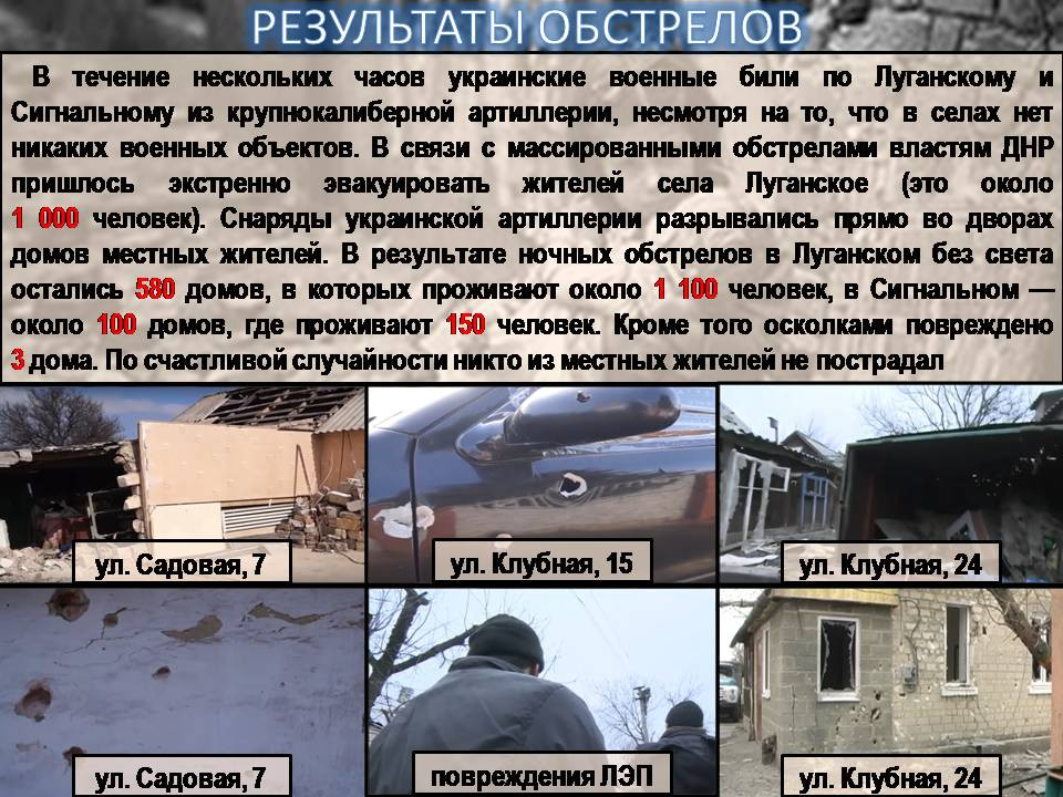 «Обстановка в Донецкой Народной Республике остается напряженной. Всего обстрелам со стороны ВСУ подверглось 17 населенных пунктов. Применялись: тяжелая артиллерия (калибрами 152 и 122-мм), танки, минометы (120 и 82-мм), а также вооружение БМП, БТРы, зенитные установки, гранатометы и стрелковое оружие», — сказал представитель командования.