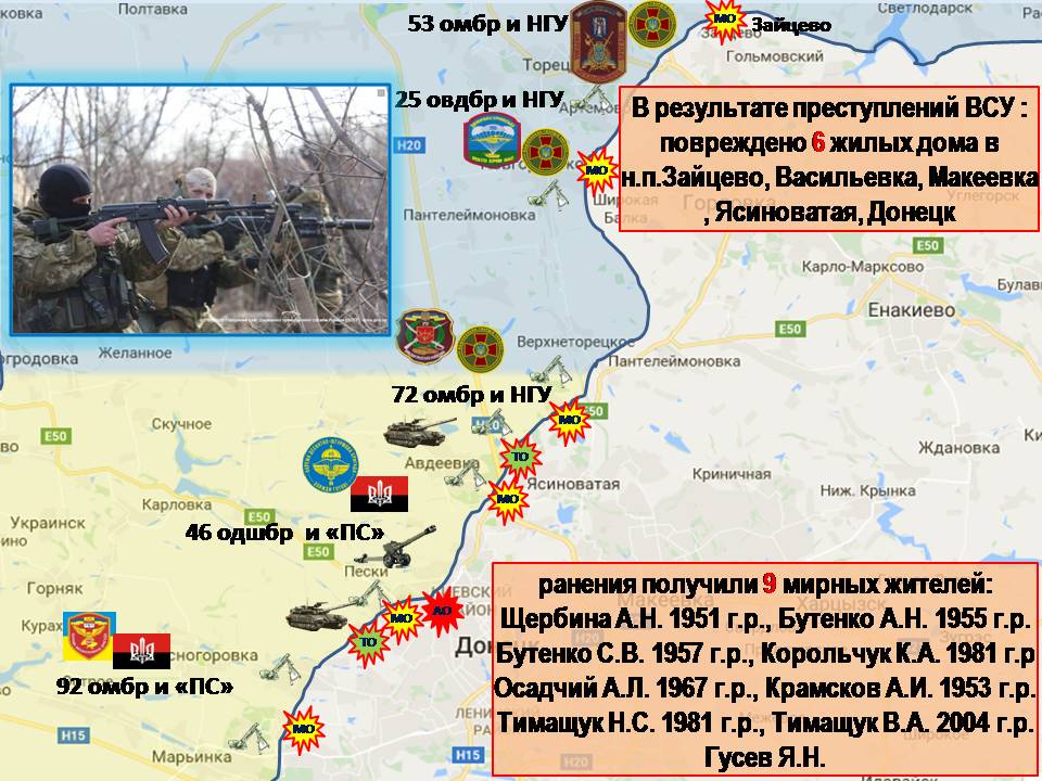 По данным командования, под огонь ВСУ за неделю попали 23 населенных пункта Республики. В частности, это Петровский и Кировский районы Донецка, а также территория столичного аэропорта; Макеевка; Горловка и поселки Зайцево, Широкая Балка, Железная Балка и Доломитное; Ясиноватая и село Спартак, Васильевка, Веселое, Жабичево, поселок Крутая Балка; Докучаевск и поселок Ясное; южные села Коминтерново, Сосновское, Саханка, Безыменное, Заиченко, Дзержинское и Куликово.