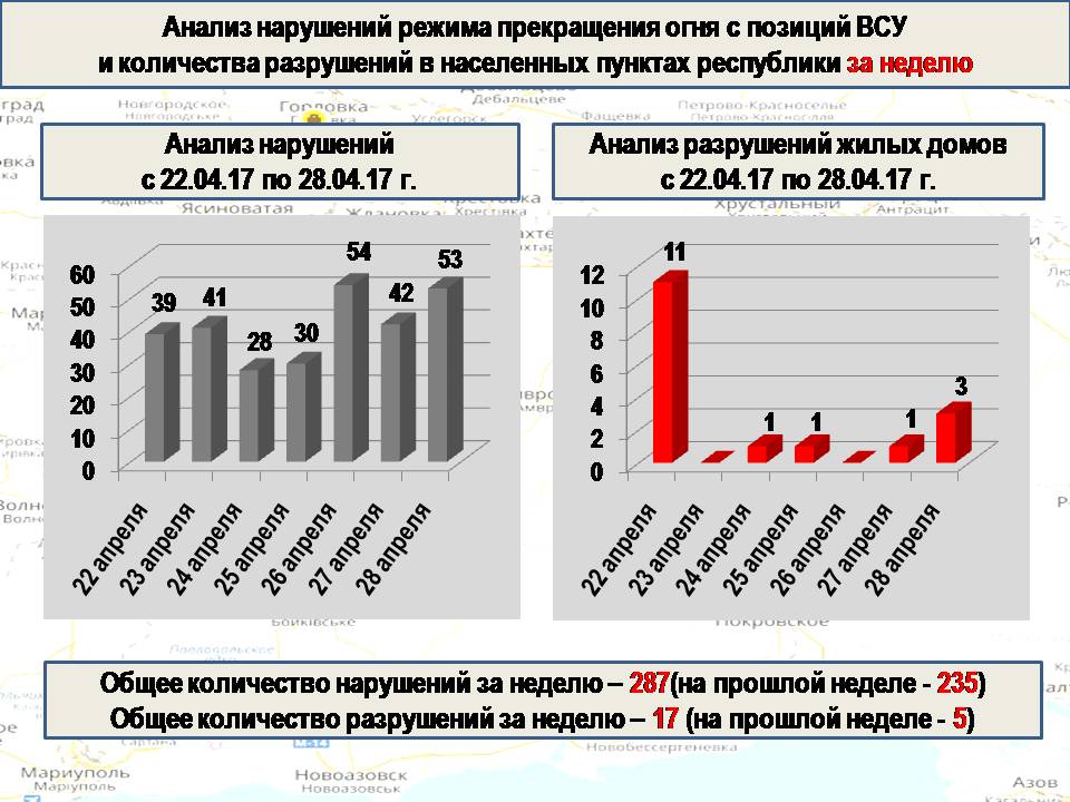 Брифинг заместителя командующего ВС ДНР полковника Басурина Э.А. на 28 апреля 2017 годаУкрофашисты за неделю почти 300 раз нарушили «режим тишины», выпустив по ДНР 1097 боеприпасовУкрофашисты за минувшую неделю 289 раз нарушили режим прекращения огня, выпустив по территории Донецкой Народной Республики 1097 снарядов и мин. Об этом сегодня заявил заместитель командующего оперативным командованием ДНР Эдуард Басурин.