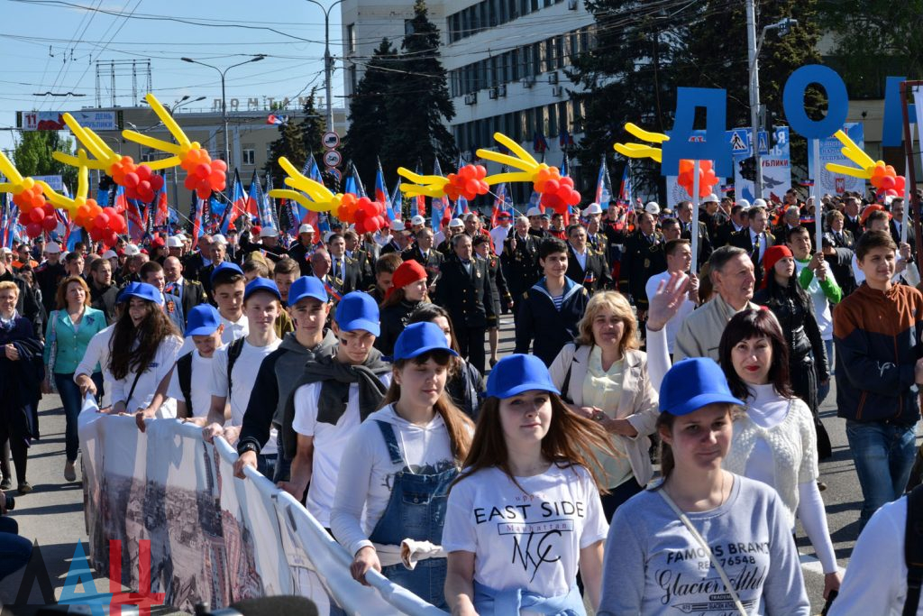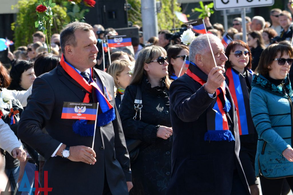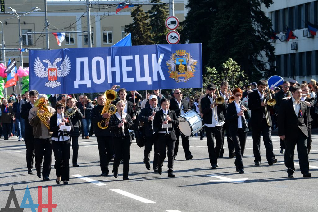Возглавляют шествие порядка ста байкеров клуба «Ночные волки» и оркестр духовых инструментов столичной филармонии. За ними следует колонна во главе с и.о. мэром Донецка Алексеем Кулемзиным, далее – делегации из разных городов и районов ДНР, активисты общественного движения «Донецкая Республика», и общественной организации «Молодая Республика». Участники шествия несут флаги Республики и цветы.