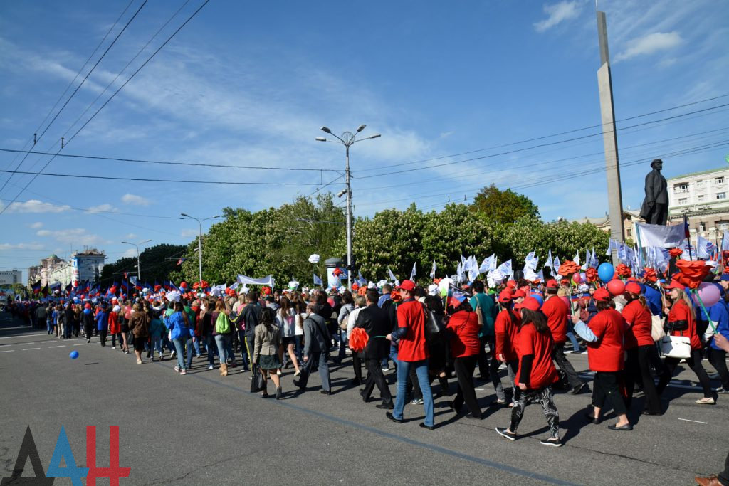Параллельно шествию на главной площади Донецка проходит и митинг Федерации профсоюзов ДНР: порядка четырех тысяч человек с транспарантами «В единстве наша сила», «Мы победим», «Профсоюзы – сила Республики» в дальнейшем присоединятся к шествию.