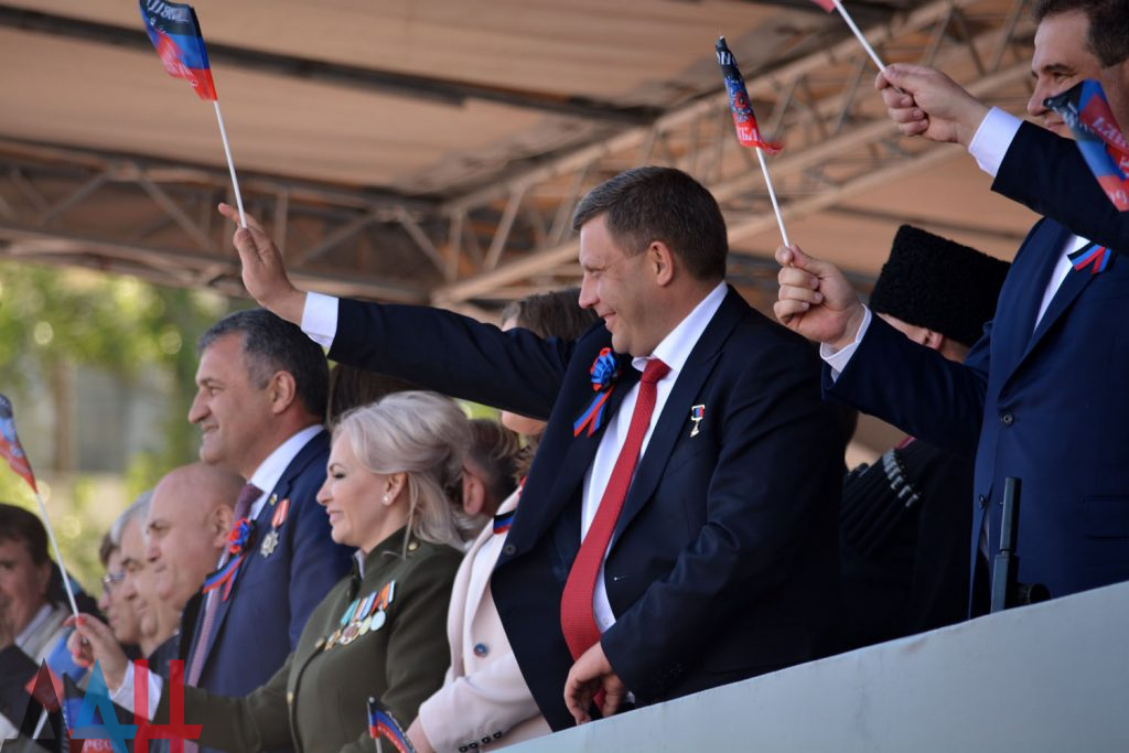 С установленной на площади Ленина трибуны демонстрантов приветствует Глава ДНР Александр Захарченко, председатель Народного Совета Денис Пушилин, специальные гости из России, Абхазии, Южной Осетии и ЛНР.