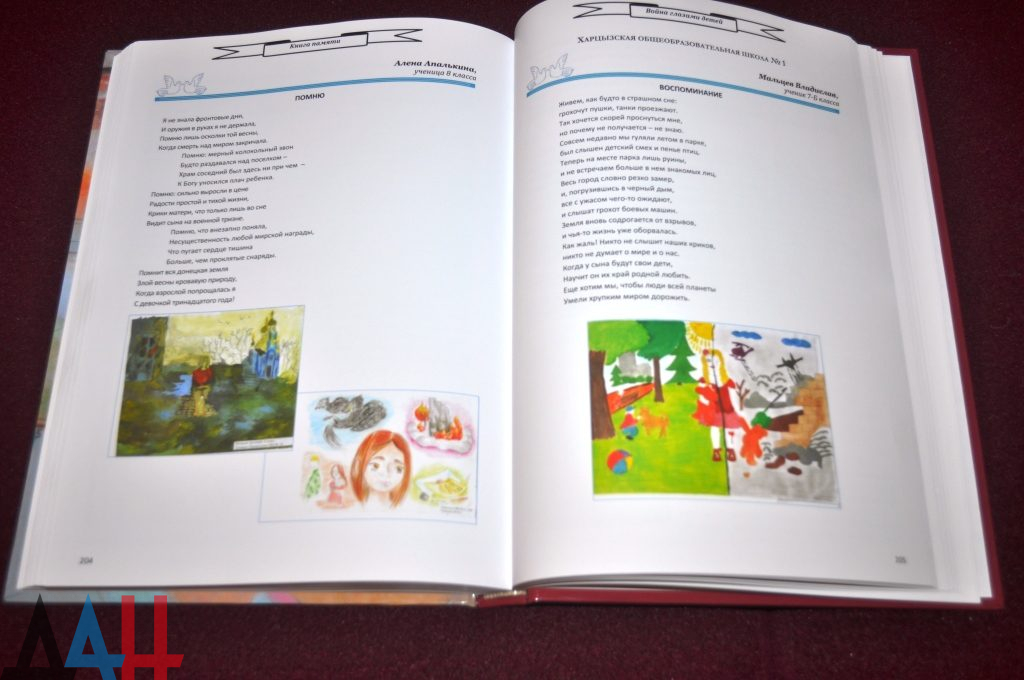 Напомним, что проект «Книга памяти: война глазами детей» стартовал осенью 2016 года. Идея собрать воспоминания детей о конфликте в Донбассе в одном издании принадлежит ясиноватским школьникам. Инициаторами проекта стали Глава ДНР Александр Захарченко и министерство образования и науки Республики. Сбор материалов длился около полугода среди школ страны. Источник