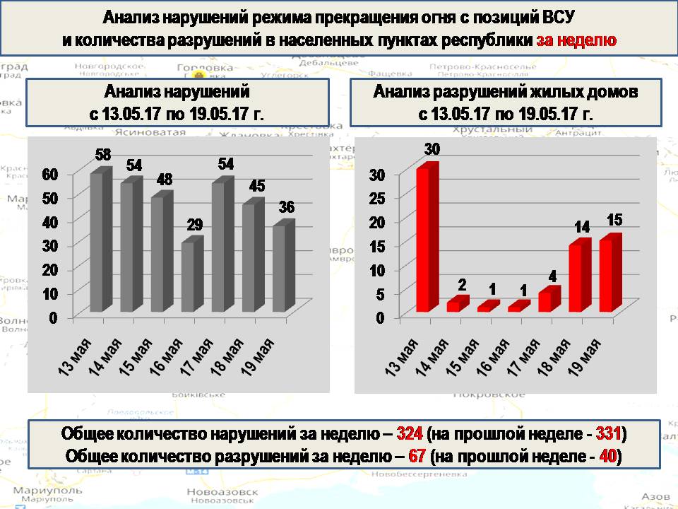 Сводка от МО ДНР 19 мая 2017. Укрофашисты за неделю выпустили по территории ДНР свыше 2 тыс. снарядов и мин, за сутки 36 раз нарушили «режим тишины»