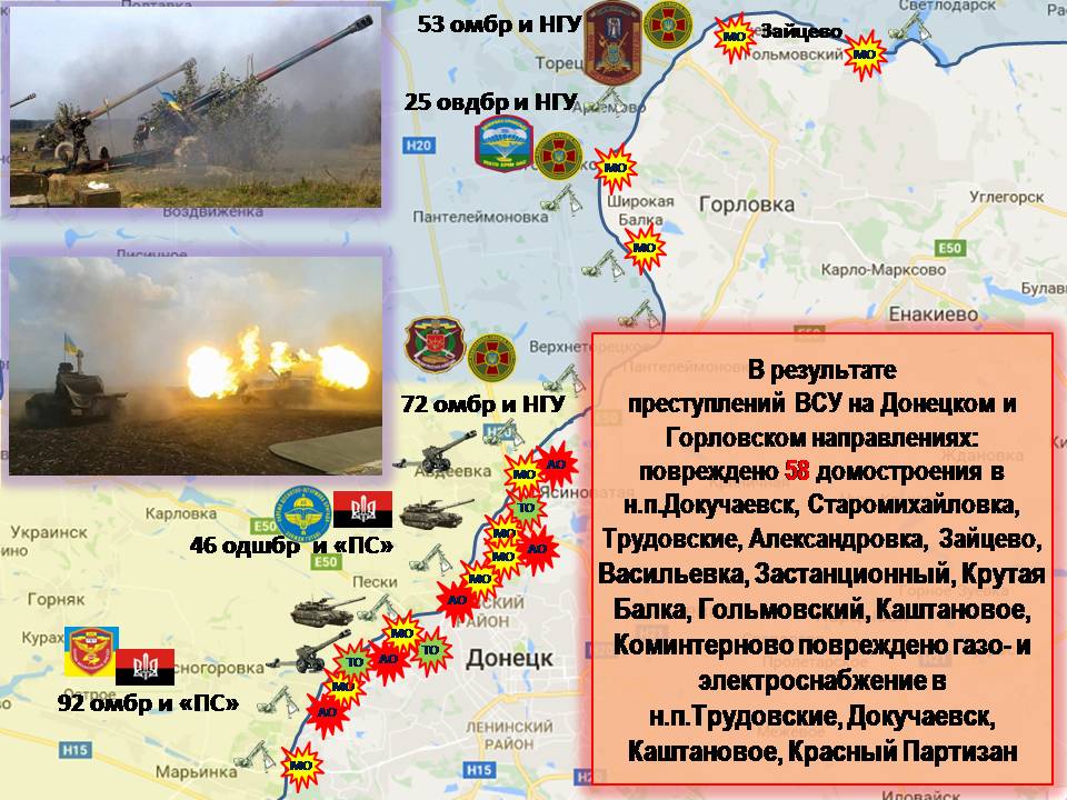 Замком добавил, что украинские подразделения вели огонь по 40 населенным пунктам ДНР. Наиболее интенсивные обстрелы были зафиксированы в Петровском, Куйбышевском и Киевском районе Донецка, поселке Крутая Балка Ясиноватского района, а также селах Саханка и Коминтерново Новоазовского района на юге Республики.