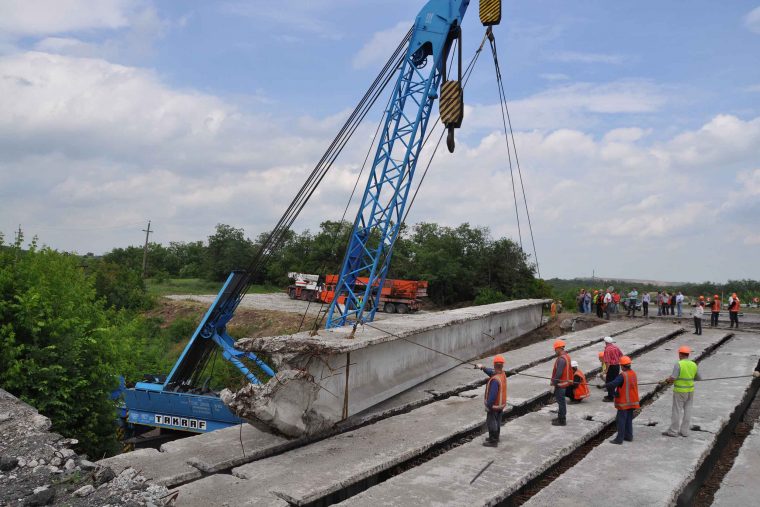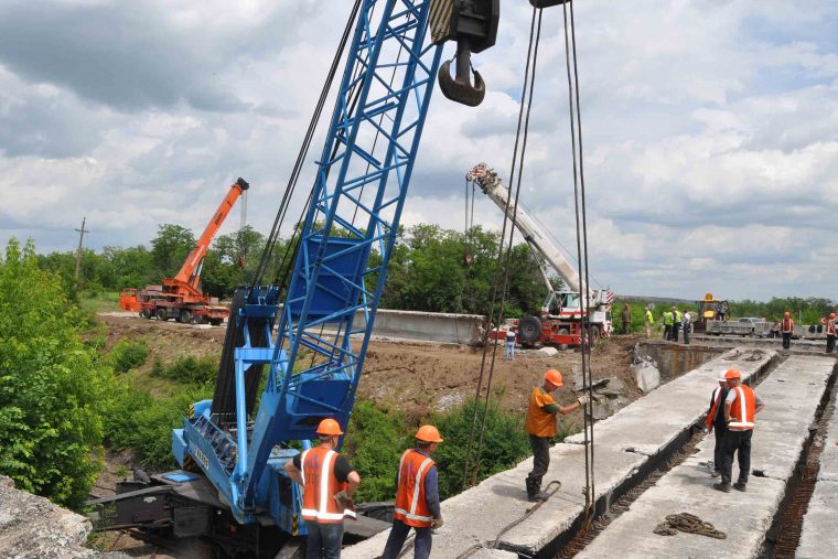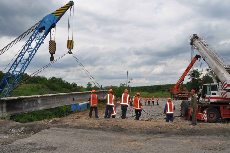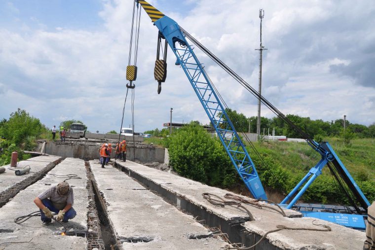 В настоящее время подрядные организации завершили один из наиболее сложных этапов капитального ремонта – демонтаж поврежденных бетонных балок пролетного строения. Работы были осложнены значительной длиной путепровода – она составляет более 33 метров. При этом каждая балка весит более 60 тонн. Для организации эффективной и безопасной работы был привлечен железнодорожный кран восстановительного поезда ГП «Донецкая железная дорога» и два автокрана. На время проведения ремонтных работ на данном участке железной дороги было перекрыто движение поездов.