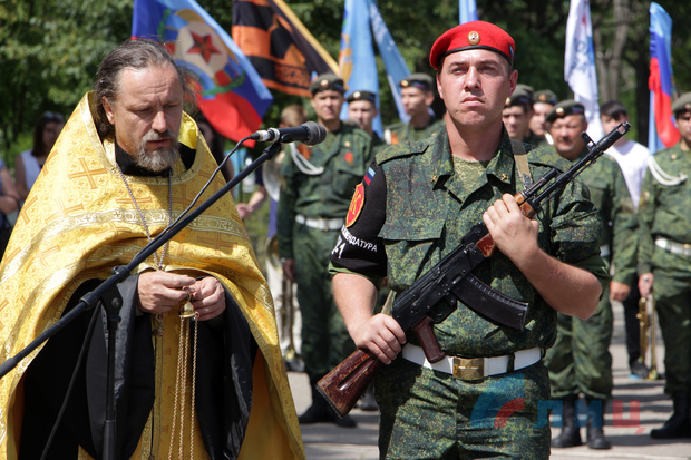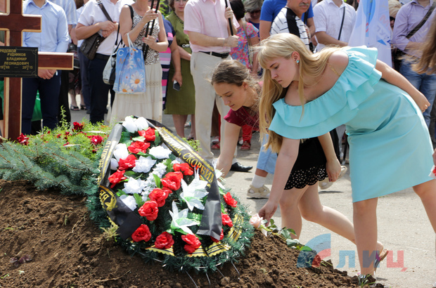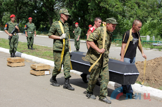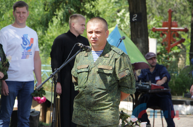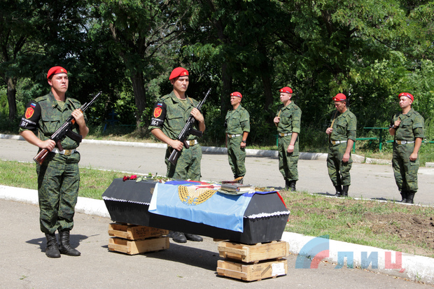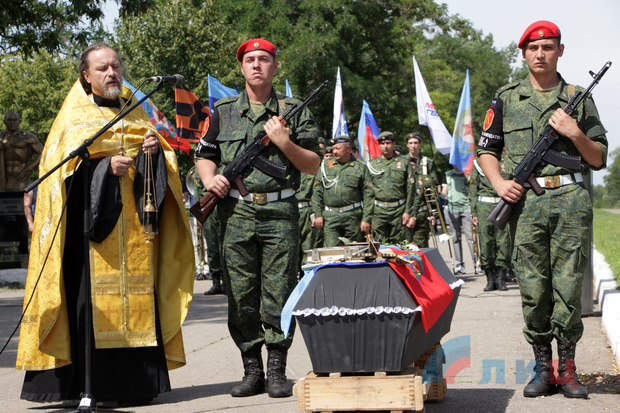 "Сегодня мы провожаем в последний путь нашего защитника, нашего доблестного воина, нашего брата, который героически погиб при освобождении своей родной земли от коричневой чумы, которая в 21-м веке подняла свою голову", - отметил официальный представитель Народной милиции подполковник Андрей Марочко.