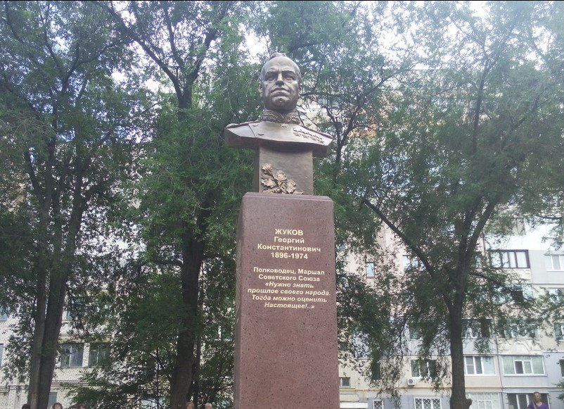 Два года назад бюст четырежды Героя Советского Союза Маршала Георгия Константиновича Жукова передал в дар Луганску Народный артист СССР Василий Лановой. Торжественная церемония открытия памятника состоялась в 70-ю годовщину первого Парада Победы во дворе луганской школы №36.