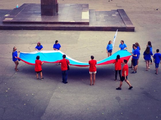 Молодежные активисты Краснодона в рамках праздничных мероприятий, приуроченных ко Дню Государственного флага России, ознакомились с историей возникновения праздника, узнали значение цветов триколора и флага ЛНР. Акция завершилась красочным флешмобом, в ходе которого юноши и девушки скандировали "Флаг Державы – символ славы!", составив флаг Российской Федерации под песню известного российского исполнителя Олега Газманова "Вперед, Россия!".