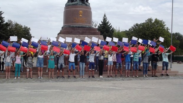 В Луганске организатором флешмоба, приуроченного ко Дню Государственного флага РФ, стало управление по делам детей, семьи и молодежи столичной мэрии при поддержке луганского территориального отделения общественного движения (ОД) "Мир Луганщине".