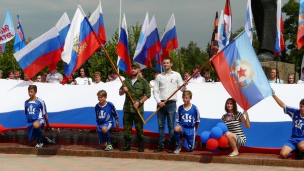 Около 30 активистов детско-юношеской организации "Молодая гвардия" ОД "Мир Луганщине" на площади возле здания столичной администрации, скандируя лозунги "Наш выбор – наше будущее!" и "Пока мы едины, мы непобедимы!", развернули 30-метровый флаг Республики как символ связи с Русским миром.