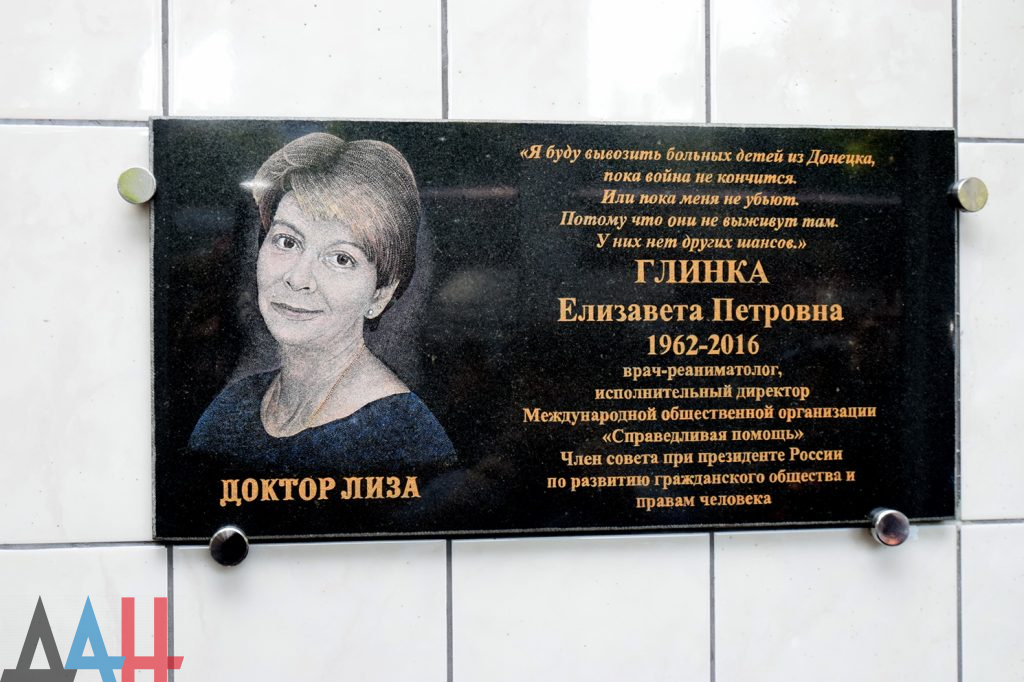 Мемориальная доска в память об общественном деятеле, члене Совета по развитию гражданского общества и правам человека при президенте РФ Елизавете Глинке, известной как Доктор Лиза, была открыта сегодня при входе в Республиканскую детскую клиническую больницу. Именно оттуда Глинка вывозила тяжелобольных детей Донбасса на лечение в Российскую Федерацию.