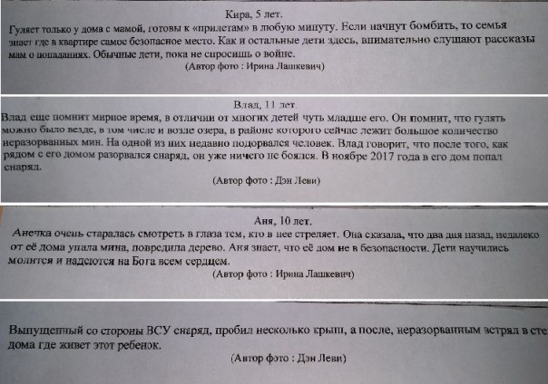 «Каждого ребенка мы просили посмотреть в глаза тем, кто в них стреляет. Это - не просто портреты детей, это - взгляд-приговор, взгляд-обвинение, взгляд-крик. Дети очень серьезно относились к такой просьбе: они верили, что своим взглядом смогут повлиять на тех, кто их ежедневно расстреливает. Этот проект - боль, от которой не уйти. Это - дань детям, живущим под обстрелами, наш маленький вклад в историю, чтобы помнили, попытка достучаться до тех, кто развязал эту необъявленную кровопролитную войну», - отметила военкор Ирина Лашкевич.