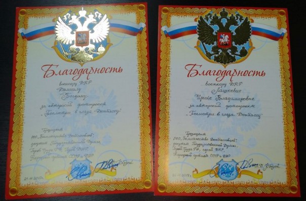 «С первых дней войны «Землячество Донбассовцев» оказывает всевозможную помощь нашим детям, находящимся там в тяжелейших условиях. И мне очень хочется надеяться, что когда победа придет на нашу Родину - а так обязательно будет! - авторы данного проекта сделают уже другую фотовыставку: фотовыставку по-настоящему счастливых детей», - заявил вице-президент «Землячества Донбассовцев» Пётр Акаёмов. Он вручил авторам проекта благодарности от Президента организации, депутата ГД РФ, Героя ДНР, народного артиста СССР и ДНР Иосифа Кобзона.