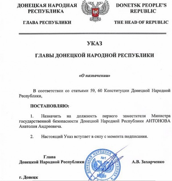 МГБ является самым закрытым ведомством ЛНР, а потому деталей биографии нового министра в открытом доступе нет. Однако, всплыла одна интересная деталь. Человек с полностью совпадающими данными – Антонов Анатолий Андреевич – был назначен в июне 2017 года на должность первого заместителя министра государственной безопасности ДНР. Указ за номером 149 был подписан 19 июня главой Республики Александром Захарченко и размещен на официальном сайте ДНР.