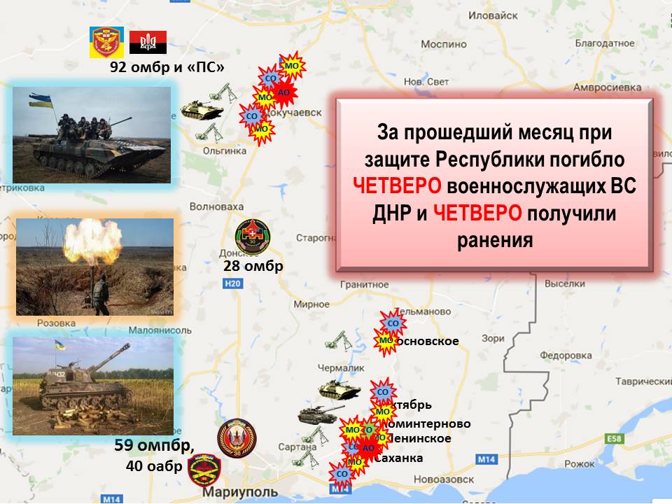 «За прошедшие сутки на Донецком направлении по районам десяти населенных пунктов противник выпустил семьдесят одну мину калибра 120 и 82 мм. Кроме этого, противник вел обстрелы с применением различных типов гранатометов и стрелкового оружия.