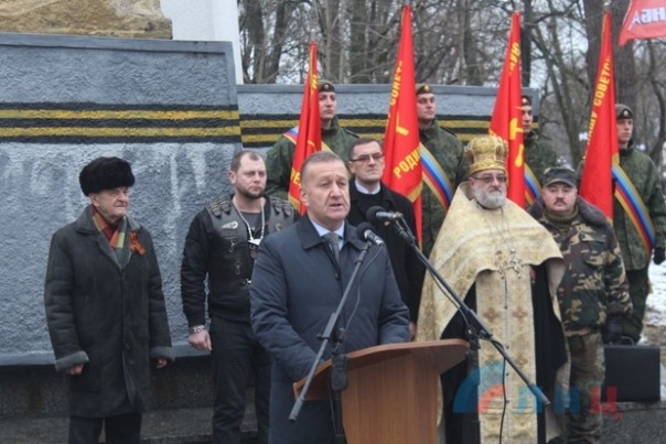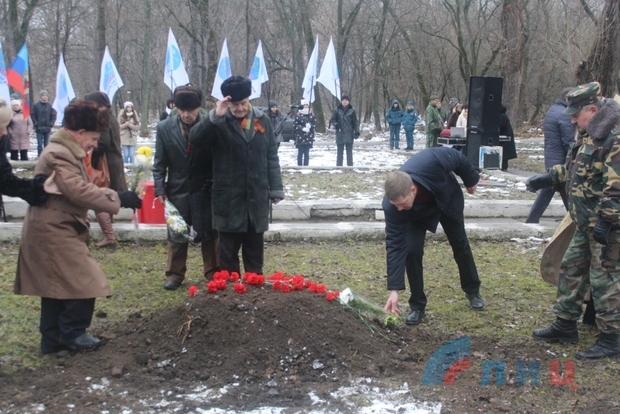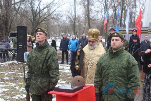 Панихиду по погибшему солдату провел настоятель храма при Республиканской клинической больнице протоиерей Сергий. Как дань подвигу, героизму и мужеству тех, кто выстоял и одержал победу ценой своей жизни, к монументу на братской могиле курсанты Луганского казачьего кадетского корпуса имени маршала авиации Ефимова возложили Гирлянду славы.