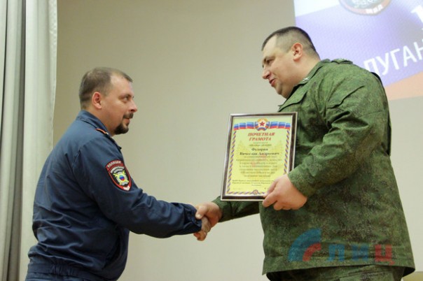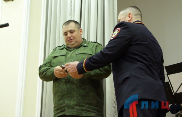 "Братья по оружию! Сегодня от всего личного состава и от начальствующего состава Народной милиции поздравляю вас с этой замечательной датой", - обратился на собрании исполняющий обязанности начальника управления Народной милиции ЛНР полковник Михаил Филипоненко.