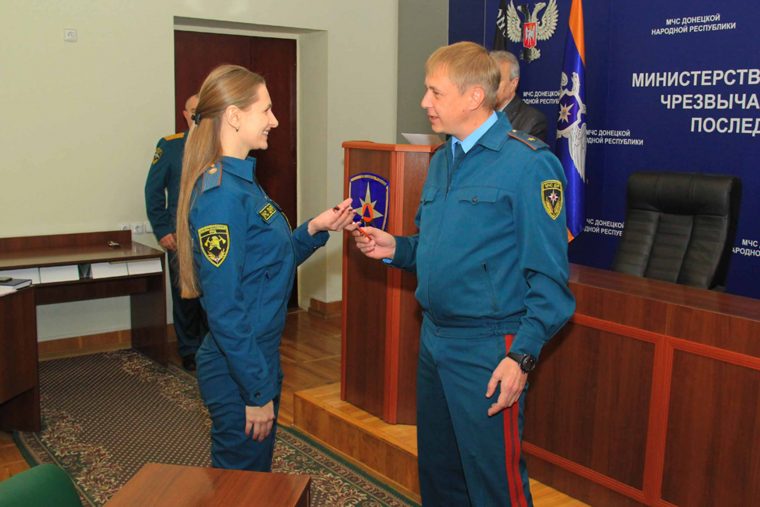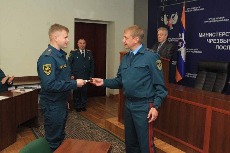 В торжественной обстановке министр по делам ГО, ЧС и ликвидации последствий стихийных бедствий, генерал-майор службы гражданской защиты Алексей Кострубицкий вручил троим выпускникам погоны лейтенанта службы гражданской защиты МЧС ДНР и пожелал успешного прохождения службы. Источник