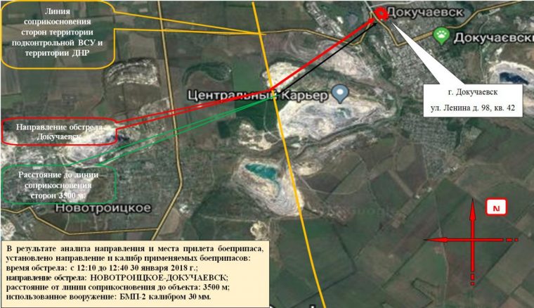 В результате анализа направления и места попадания боеприпасов установлено направление и калибр применяемых снарядов во время обстрела Докучаевска 30 января с 12:10 до 12:40 со стороны ВСУ (район Новотроицкого). Об этом сообщает пресс-служба Представительства ДНР в СЦКК и переговорном процессе.
