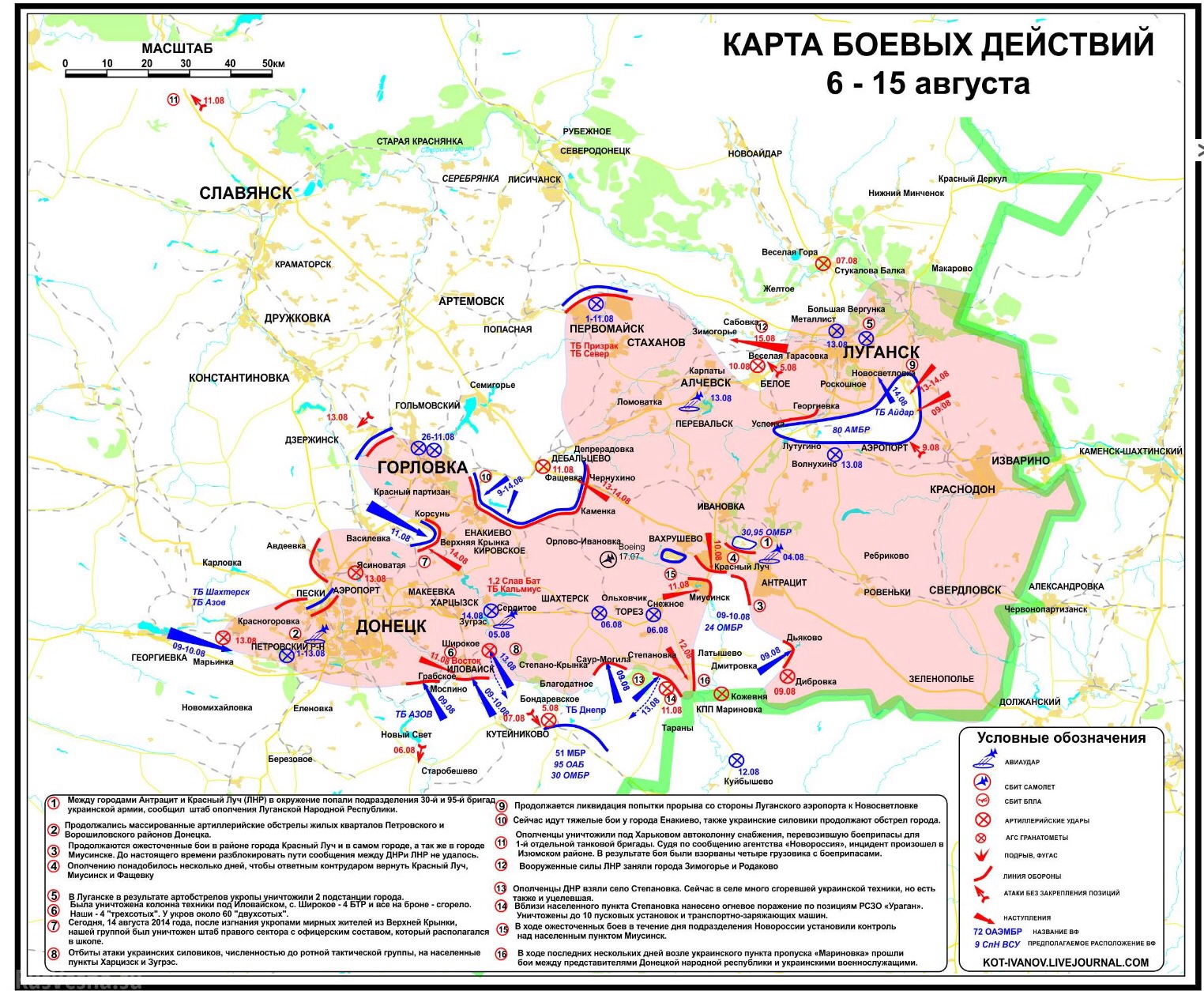 В последние 2 дня, как уже предупреждалось ранее, ополчение наконец то смогло ввести в бой резервы высвободившиеся после разгрома Южного Котла и некоторую часть трофеев оттуда. Это сразу улучшило ситуацию на фронте - локализован прорыв на Красный Луч, нанесено поражение группировке хунты в районе Снежного и Миусинска, осуществлен прорыв к Мариновке, что привело к образованию нового мини-котла, которые уже стали обыденностью. При этом было остановлено наступление хунты на Енакиево и Горловку, а так же завязаны бои на подступах к Дебальцеву. В целом, контрнаступление Захарченко выглядит более адекватным, нежели контрнаступление Болотова. Хотя это скорее не контрнаступление, а локальные контрудары, которыми стабилизируют фронт.