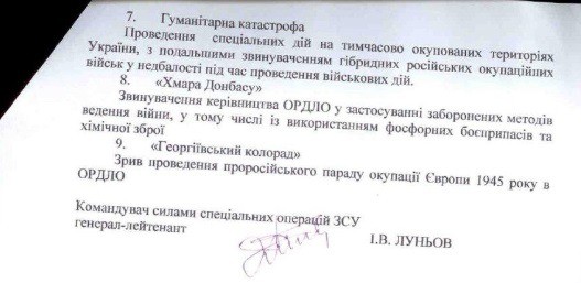 Обвинение руководства ОРДЛО (руководства ЛДНР – прим. редактора) в использовании запрещенных методов ведения войны, в том числе, с использованием фосфорного и химического оружия.