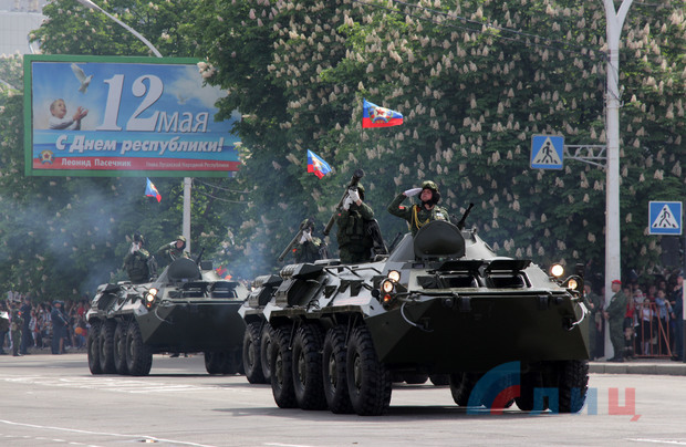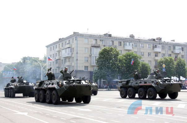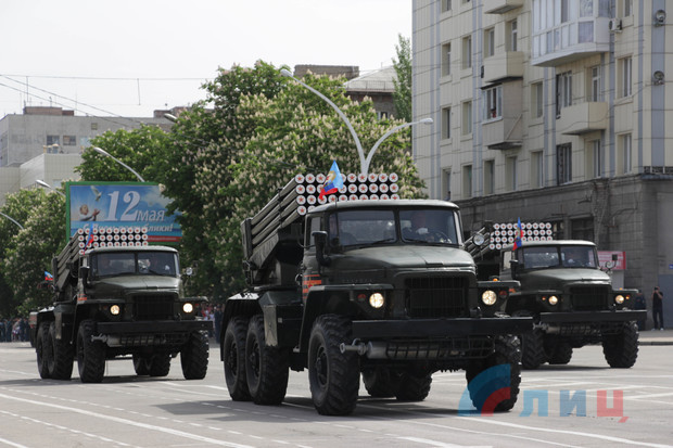 В Народной милиции рассказали, что по Театральной площади проехали танки Т-72, боевые машины пехоты БМП-2, бронетранспортеры БТР-80, 152-мм самоходные артиллерийские установки (САУ) "Гвоздика", 152-мм гаубицы 2А65 "Мста-Б", 122-мм гаубицы Д-30, реактивные системы залпового огня БМ-21 "Град". Замыкали колонну зенитно-ракетные комплексы 9К35 "Стрела-10".