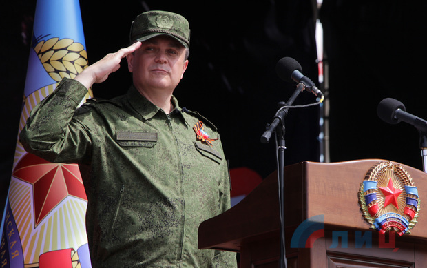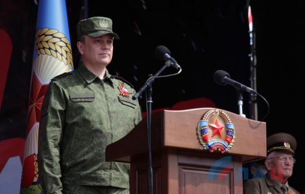 Военный парад принимал верховный главнокомандующий, исполняющий обязанности главы Республики Леонид Пасечник, командовал парадом командир оперативно-тактического объединения ЛНР гвардии полковник Ян Лещенко.