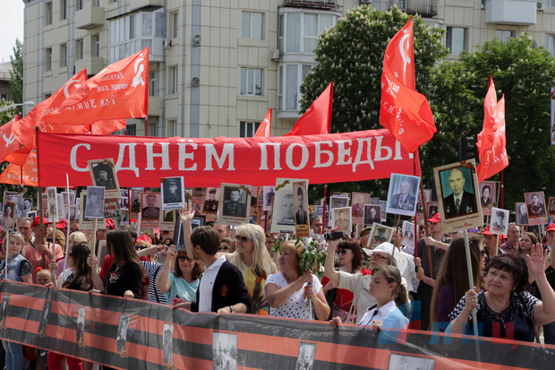 По окончании парада на Театральной площади началось шествие "Бессмертного полка", участники которого несут портреты близких, защищавших Родину во время Великой Отечественной войны и в ходе киевской агрессии в Донбассе.