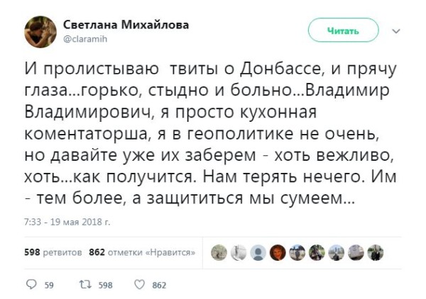 Трое военнослужащих ДНР были взяты в плен, как минимум, один убит. Утром при обстреле поселка шахты Гагарина ранения получили четверо мирных жителей, всего же по итогам недели обострения жертвами обстрелов Горловки и прилегающих сел стали 15 человек – четверо погибли, 11 человек получили ранения различной степени тяжести. Официальная Россия молчит. Неофициальная, сохранившая совесть и имеющая сочувствие к горю Донбасса, реагирует вот так: