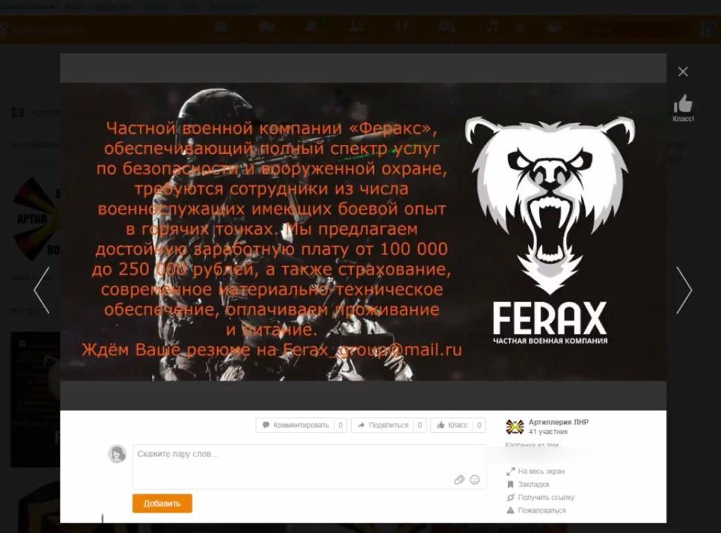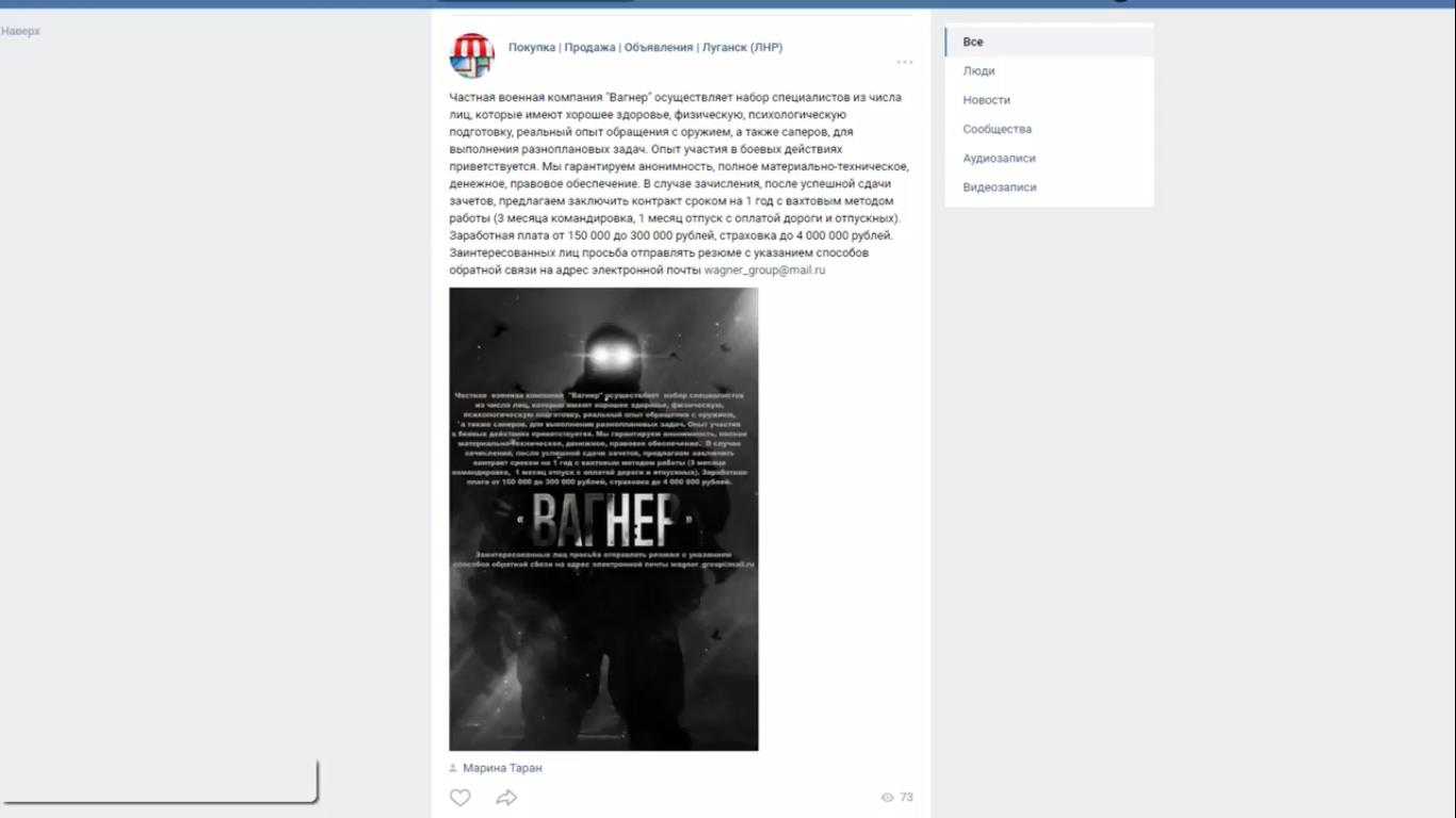 Так, от граждан Народной Республики поступают сообщения о том, что в сети «Интернет» появились объявления о наборе в, якобы, частные военные компании «Вагнер», «МАР», «Ferax» и агентство «Альянс-МСБ».