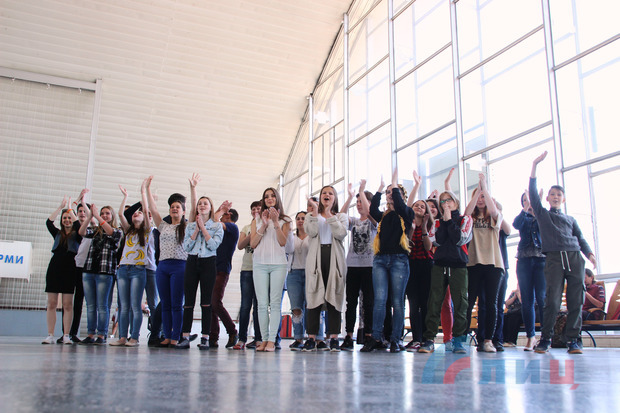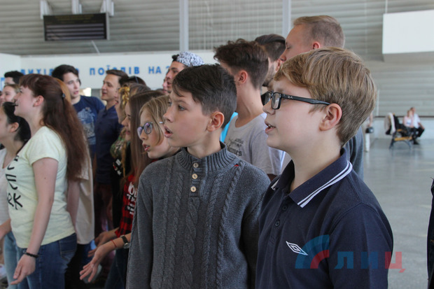 Школьники Луганска в Международный день защиты детей провели в здании столичного железнодорожного вокзала песенный флешмоб, исполнив песню Аркадия Островского на стихи Льва Ошанина "Пусть всегда будет солнце".