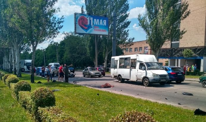 Вечером 5 июня на Площади Свободы в Донецке произошло страшное ДТП: водитель микроавтобуса Mercedes Sprinter, не убедившись в безопасности манёвра, начал выполнять поворот и в эту секунду в него влетел мотоцикл.