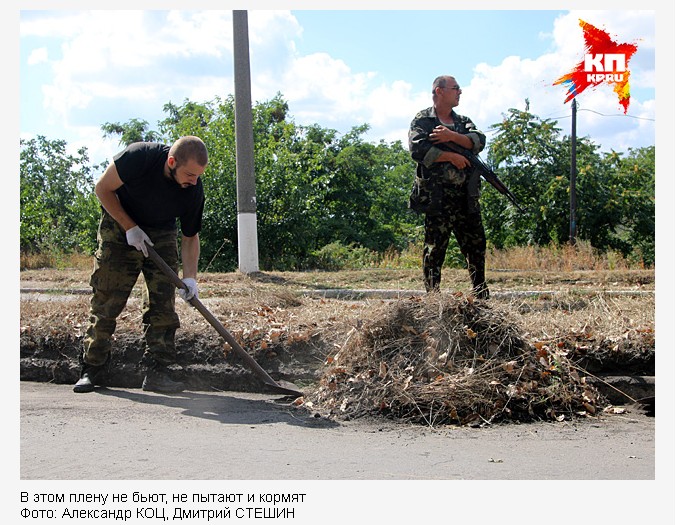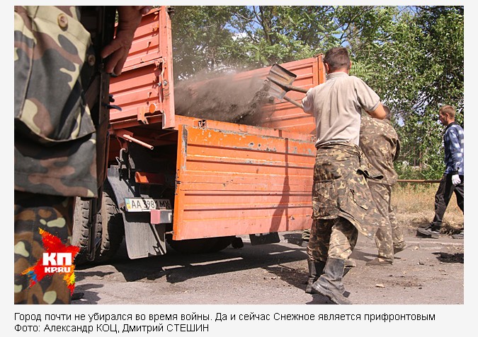 Пленные никак не отреагировали, вообще они производили вид смертельно усталых и каких-то надломленных людей. Форма пыльно-грязная, но не рваная. Синяков на лицах нет. Двадцать мужчин, как пишут официально - «призывного возраста», то есть от восемнадцати лет и за половину сотни, сидели в тени возле собранных куч мусора. Ждали грузовик коммунальщиков, чтобы увезти «эхо войны» - асфальтовую крошку от взрывов минометок, месиво, намолотое танковыми траками, землю, разбросанную взрывами с газонов, стекло и прочий мусор. Город почти не убирался во время войны. Да и сейчас Снежное является прифронтовым — в десятке километров на юг, в котлах сидят запертые тысячи украинских военных.