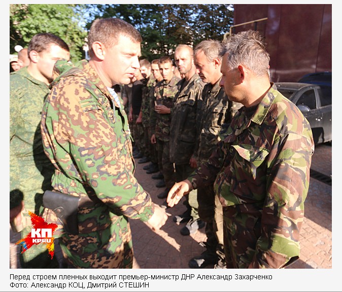 Перед строем пленных выходит премьер-министр ДНР Александр Захарченко. Накануне после обращения Владимира Путина к ополчению Новороссии он заявил, что армия ДНР предоставит коридор окруженным украинским войскам. Но при одном условии, они должны оставить в котле всю свою технику и тяжелое вооружение.