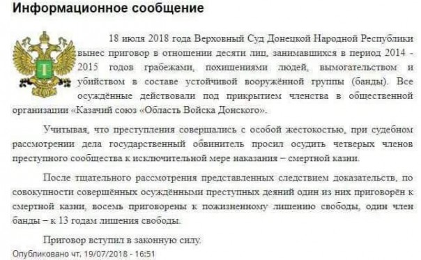 В ДНР вынесли смертный приговор и пожизненные сроки банде казаков