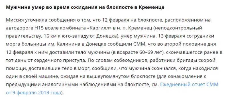 13 февраля сотрудники морга донецкой больницы имени Калинина сообщили наблюдателям ОБСЕ, что во второй половине дня 12 февраля к ним доставили тело мужчины, скончавшегося от сердечного приступа. Мужчина находился в своем автомобиле один, он ожидал проезда на территорию Украины.