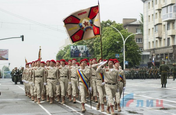 В параде приняли участие действующие военнослужащие, сотрудники правоохранительных органов ЛНР, МЧС, курсанты Луганского казачьего кадетского корпуса имени маршала авиации Александра Ефимова.