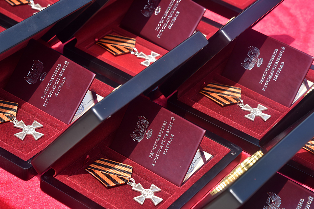 За отличия, проявленные в боевых действиях по защите Донецкой Народной Республики, личное мужество и героизм 10 военнослужащих награждены знаками отличия «Георгиевский крест» III и IV степеней, двое из них – посмертно.