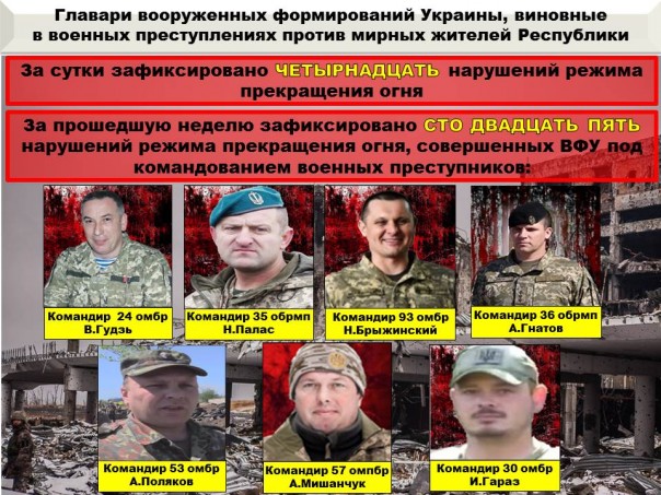 Он также добавил, что все сведения с приложением фото- и видеоматериалов будут направлены представителям международных организаций, находящихся в Республике, а также переданы в Генеральную прокуратуру для возбуждения уголовных дел в отношении военных преступников – командиров бригад ВФУ Брыжинского, Гудзя, Паласа, Гнатова и Полякова.
