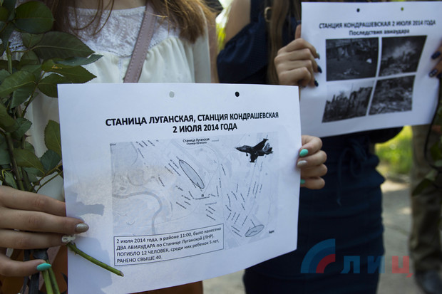 Участники акции представили выдержки из материалов общественного расследования "Применение вооруженными силами Украины штурмовой авиации против мирных жителей в ходе вооруженного конфликта в Донбассе", минутой молчания почтили память жертв украинской агрессии в Донбассе и возложили венки и цветы к памятному знаку погибшим детям Луганщины.