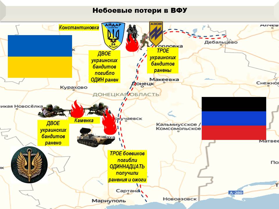 В это же время на Мариупольском направлении в ходе пьяной перестрелки между боевиками 35-й бригады и представителями «украинской добровольческой армии» в Каменке получили ранения два морпеха. По данным разведки, один «доброволец» также получил ранения, от которых впоследствии скончался.