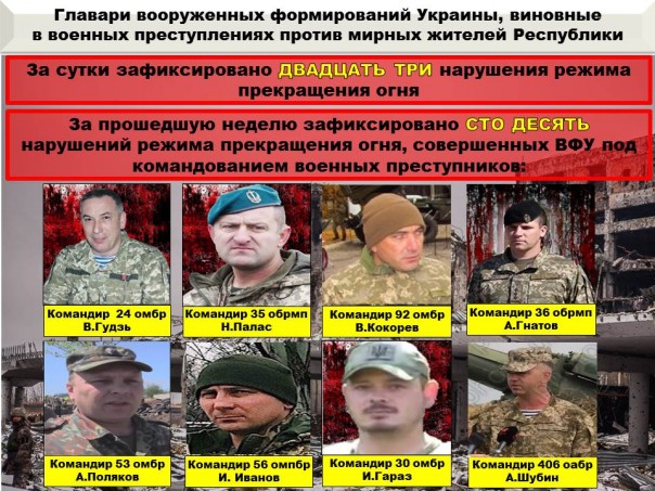 Он добавил, что все сведения с приложением фото- и видеоматериалов направлены представителям международных организаций, находящихся в Республике, а также переданы в Генеральную прокуратуру для возбуждения уголовных дел в отношении командиров бригад, дающих приказы на обстрелы территории Республики — военных преступников Гараза, Гудзя, Паласа, Кокорева, Полякова, Иванова, Гнатова и Шубина.