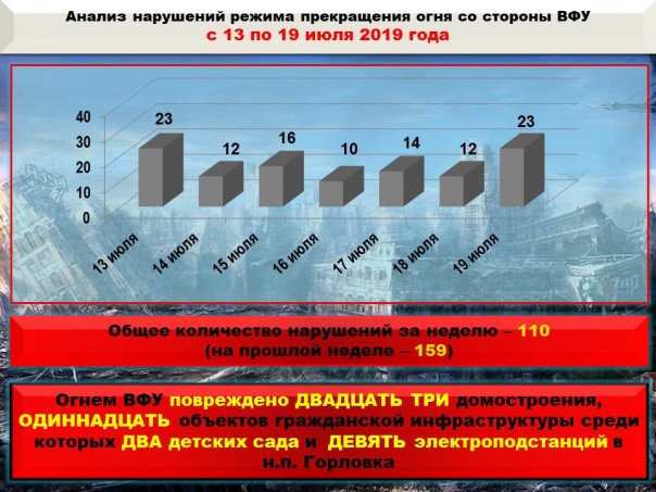 Зафиксировано сто десять нарушений украинскими боевиками режима прекращения огня за минувшую неделю. По жилым районам, объектам инфраструктуры и сельскохозяйственным угодьям Республики выпущено семьсот девятнадцать мин и артиллерийских снарядов, из них шесть снарядов 152-мм калибра, двадцать четыре снаряда 122-мм калибра и четыреста двенадцать мин 120-мм калибра. В результате обстрелов повреждены двадцать три домостроения, одиннадцать объектов гражданской инфраструктуры, среди которых два детских сада и девять электроподстанций. Об этом 19 июля на брифинге в Донецке сообщил начальник пресс-службы УНМ ДНР, майор Даниил Безсонов.
