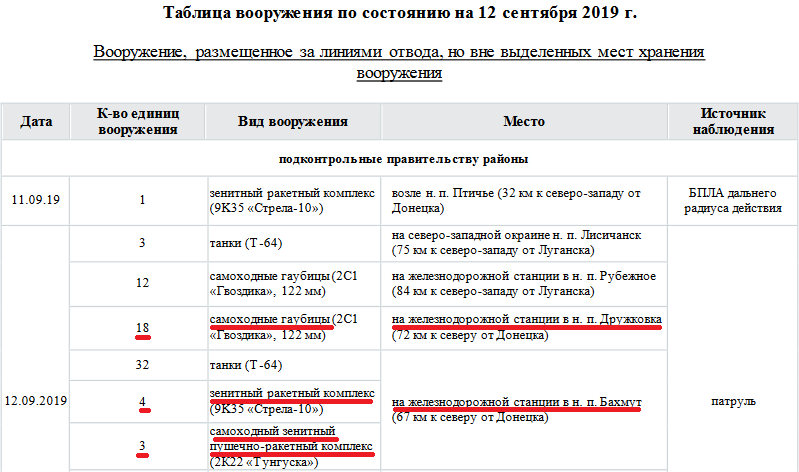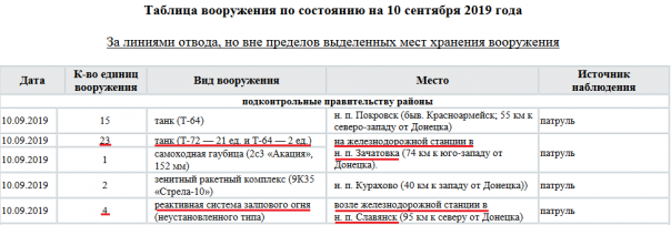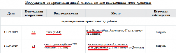В отчете по состоянию на 11.09.2019 г. зафиксированы танки, а также наличие РСЗО на железнодорожных вокзалах в Зачатовке и Славянске: