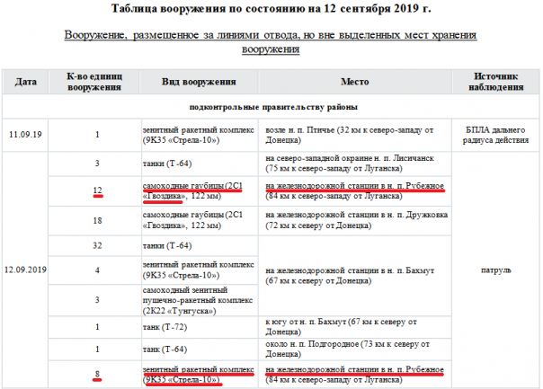 Так, на жд станции в Рубежном патруль СММ зафиксировал нахождение железнодорожного состава с самоходными гаубицами и зенитно-ракетными комплексами, что отражено в ежедневном отчете от 13.09.2019 года: