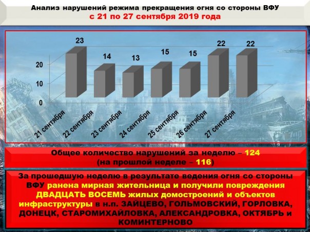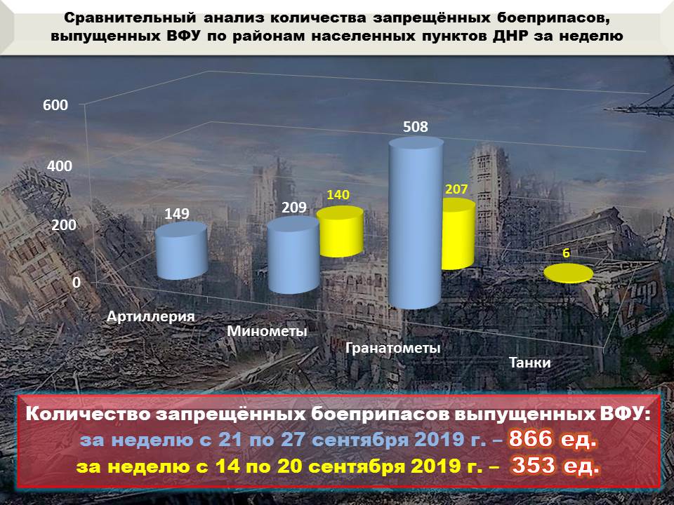 Сводка от УНМ ДНР 27.09.2019. Недельная сводка. Украинские боевики за неделю выпустили по ДНР более 350 боеприпасов крупных калибров, ранены мирные жители