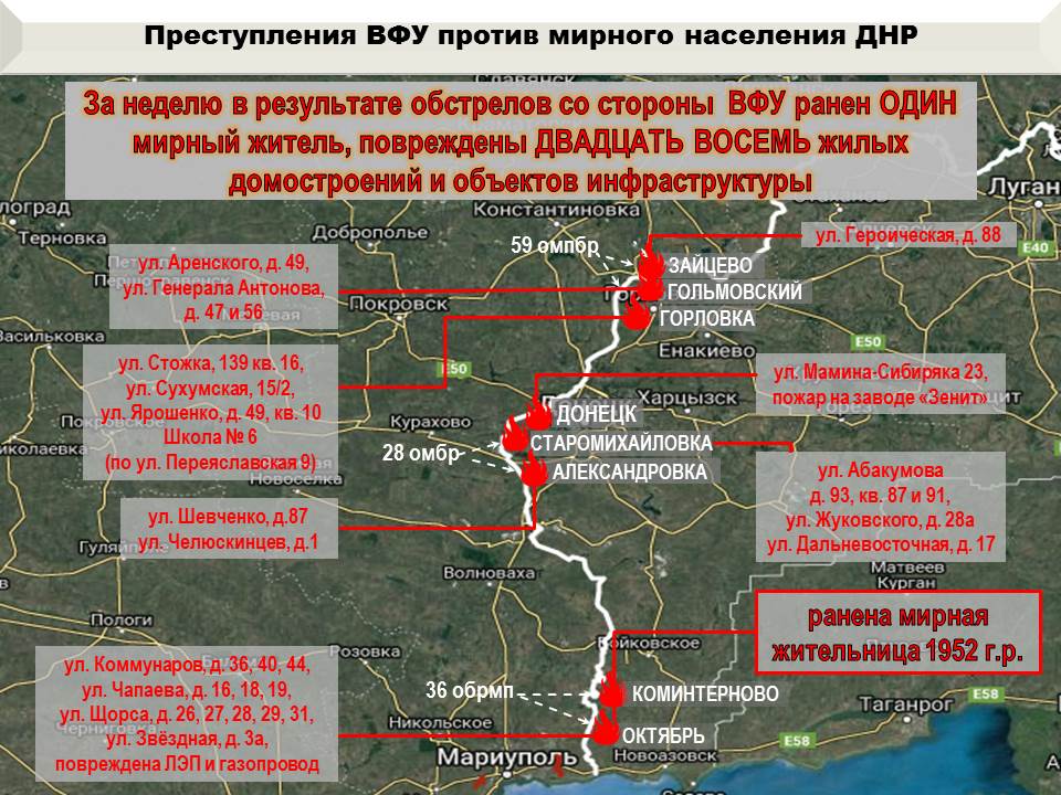 В результате обстрелов ВФУ ранена мирная жительница села Коминтерново 1952 г. р., повреждены двадцать восемь жилых домостроений и объектов инфраструктуры в Горловке, Зайцево (южном), Гольмовском, Донецке, Старомихайловке, Александровке, Октябре и Коминтерново», — заявил Басурин.