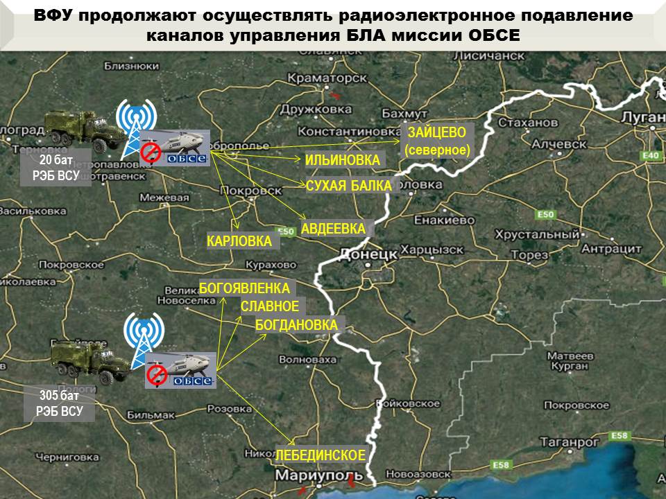 Он также отметил, что помимо средств РЭБ украинские каратели вели огонь из стрелкового оружия по беспилотникам наблюдателей ОБСЕ в районе Викторовки.