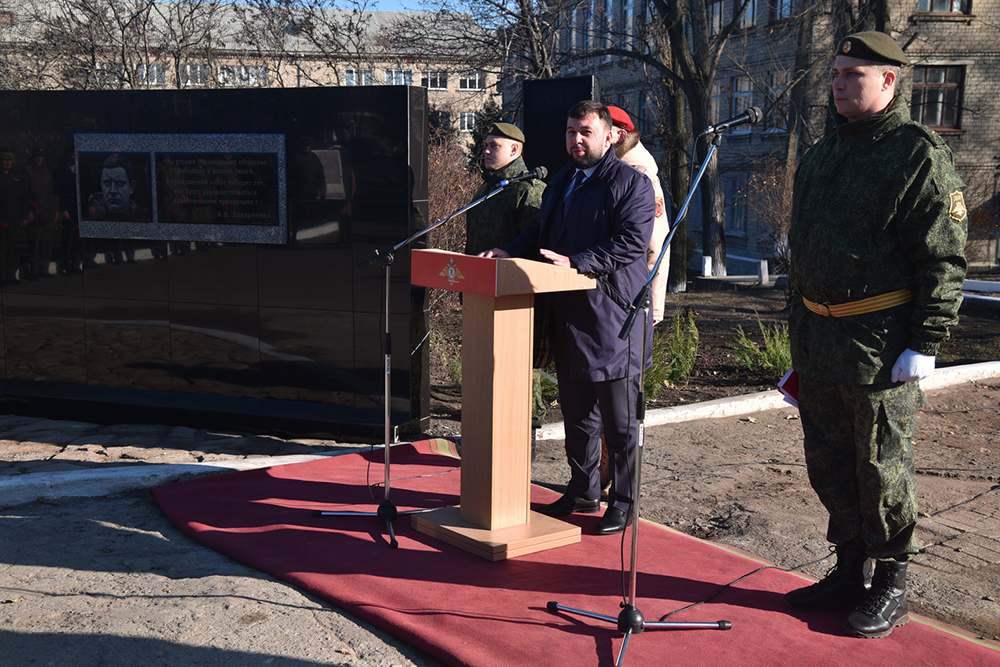 «Товарищи военнослужащие! Сегодня мы открываем мемориальную доску в память о первом Главе Донецкой Народной Республики, Герое Республики Александре Захарченко.